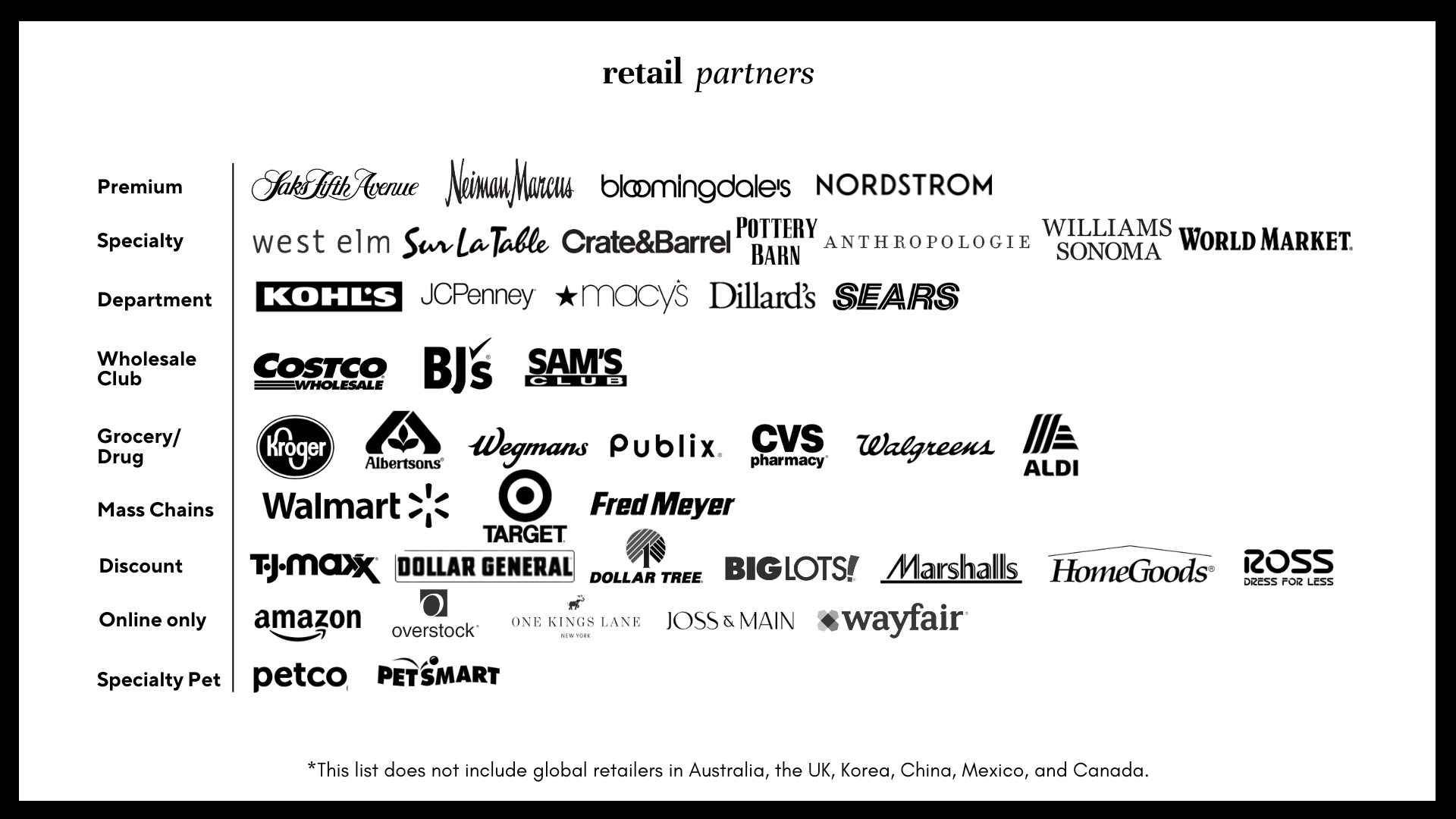We collaborate with a diverse range of retailers, from discount chains to luxury department stores and everything in between, guiding clients to navigate the complexities of both brick-and-mortar and online environments. Our deep understanding of retail dynamics, including top-tier management engagement, optimal assortments, identifying white space and margin strategies, allows us to empower clients to drive growth and cultivate successful partnerships across all retail categories.